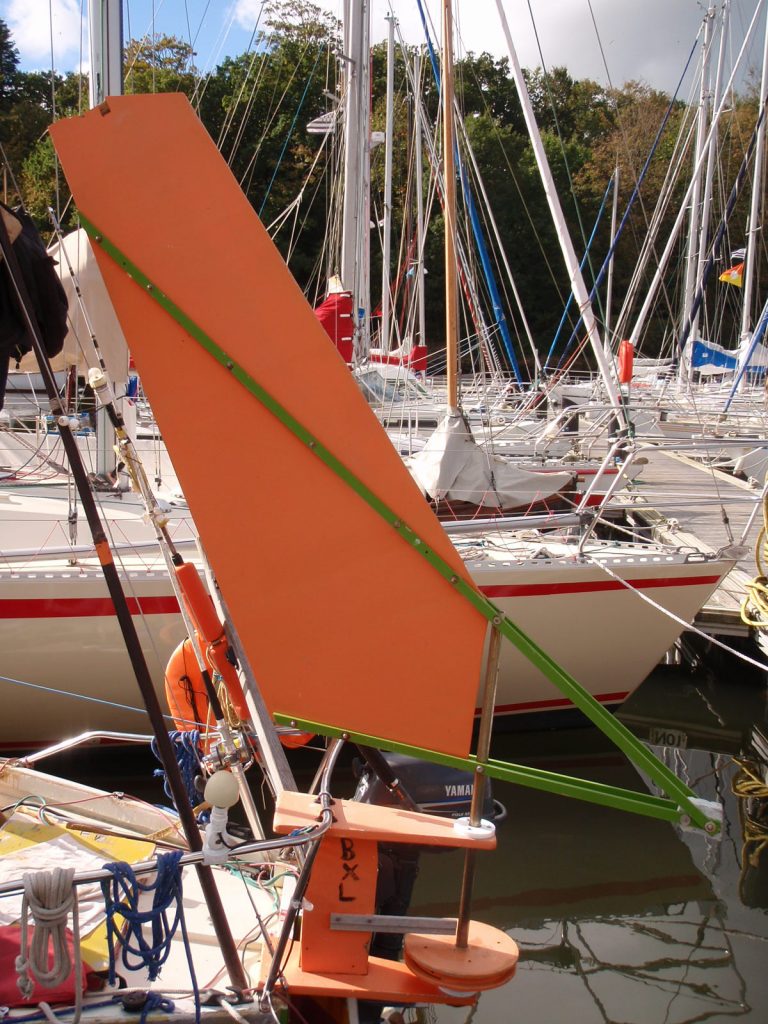1. A sima szélkormány, lényegében egy  rúd, aminek a tetejére egy vitorlát tesznek. Ez otthon is összebarkácsolható. Arra kell figyelni, hogy a vitorla minimum kétszer akkora legyen mint a kormánylapát. Itt csak a hajókormány van rákötve.